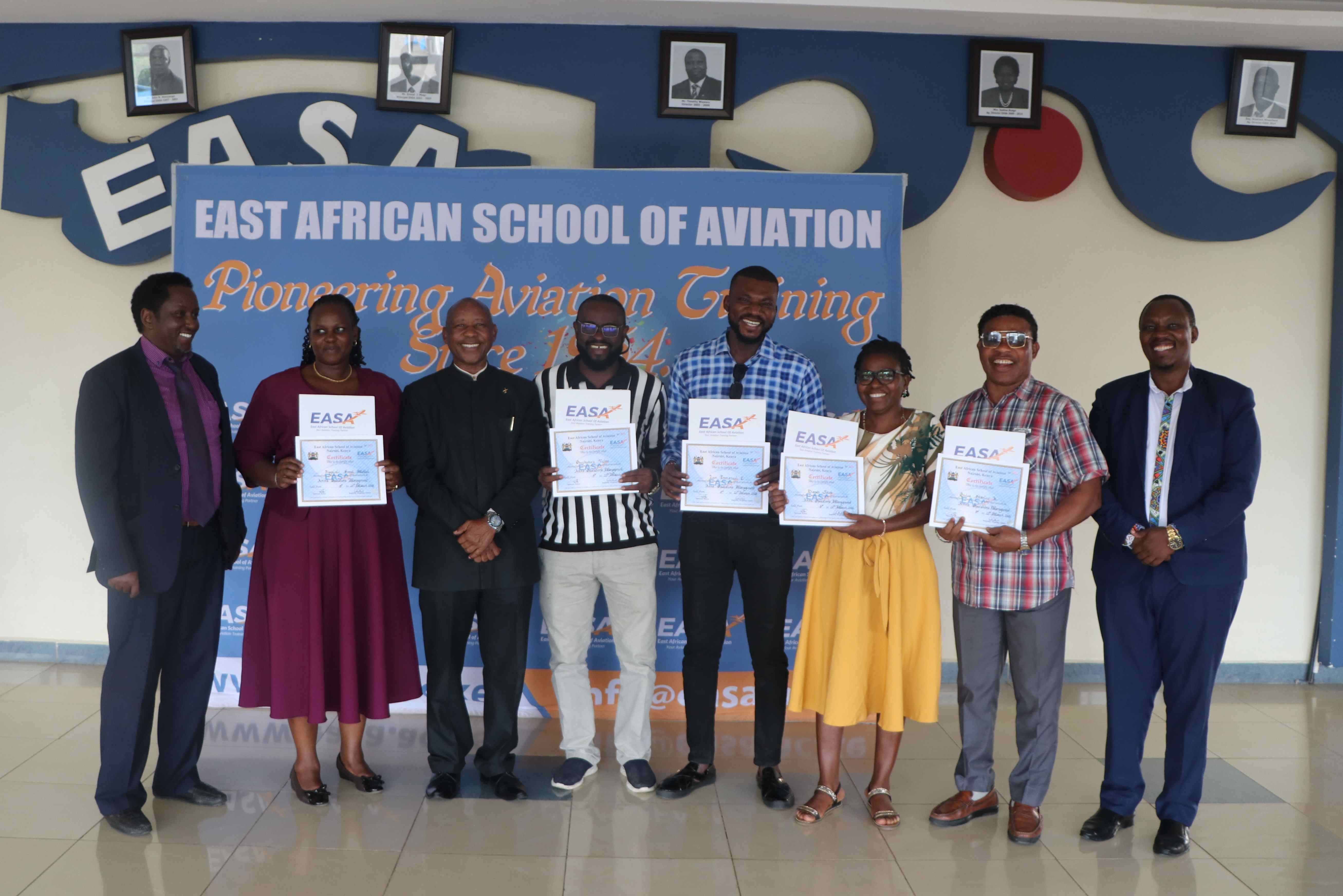 The Deputy Director, Aviation Training at the East African School of Aviation, Mr. Julius Nzyoka, presided over the closing ceremony of the AHMS Course at EASA.